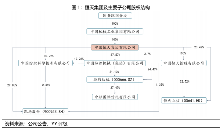 恒天集團(tuán)為老牌央企,于1998年由原國(guó)家紡織工業(yè)部所屬中國(guó)紡織機(jī)械(集團(tuán))有限公司、中國(guó)紡織工業(yè)對(duì)外經(jīng)濟(jì)技術(shù)合作公司、中國(guó)紡織機(jī)械和技術(shù)進(jìn)出口有限公司等6家公司組建而成。2017年6月,恒天集團(tuán)整體并入中國(guó)機(jī)械工業(yè)集團(tuán)有限公司,不再由國(guó)資委直接監(jiān)管,在央企層級(jí)上有所降級(jí)。