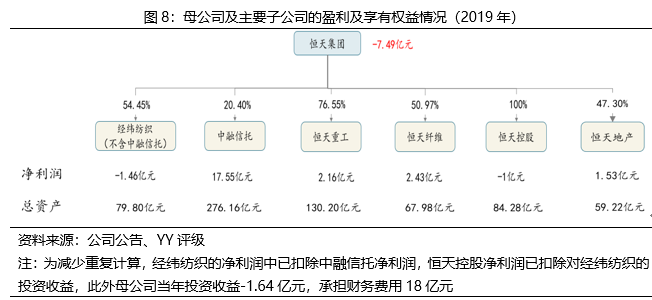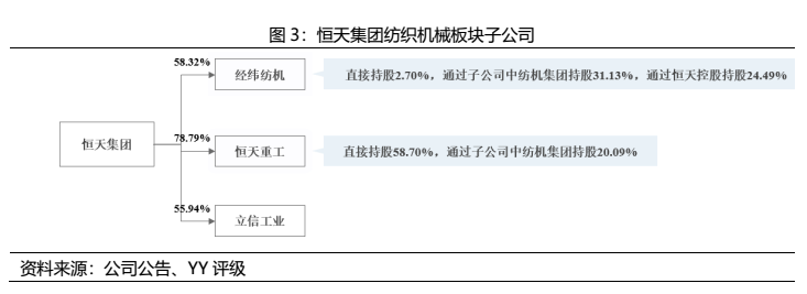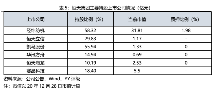 恒天集團(tuán)屬于控股型公司,旗下子公司眾多,境內(nèi)外控股上市公司3家,分別是A股上市公司經(jīng)緯紡機(jī)(持股比例58.32%)、B股上市公司凱馬股份(持股比例31.60%)和H股上市公司恒天立信(持股比例55.94%);參股上市公司華訊方舟(持股14.94%)、恒天海龍(持股10.19%)、賽晶科技(持股18.56%)。公司還是中融國(guó)際信托有限公司的大股東。除母公司外,經(jīng)緯紡機(jī)和中融信托也作為發(fā)債主體獨(dú)立發(fā)債。