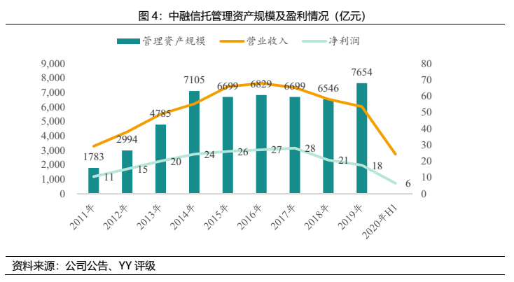 2010年,子公司經(jīng)緯紡機(jī)收購(gòu)了中植系旗下中融信托部分股權(quán),從此納入合并范圍,形成“紡機(jī)+金融”雙主業(yè)運(yùn)營(yíng)格局。中融信托也由此開啟高速發(fā)展歷程,成為行業(yè)黑馬,曾一度與中信信托、平安信托并列三大巨頭。但近兩年來,公司的收入和利潤(rùn)皆發(fā)生了下滑,發(fā)展勢(shì)頭大不如前,用益金融信托研究院數(shù)據(jù)顯示,參考信托公司主動(dòng)管理能力、盈利能力、抗風(fēng)險(xiǎn)能力等多個(gè)維度進(jìn)行分析,2019年度中融信托的綜合實(shí)力已跌至行業(yè)第九。