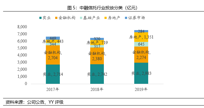 從行業(yè)投向來看,主要投向?yàn)閷?shí)業(yè)和金融機(jī)構(gòu),至2019年末分別占比39.0%、29.7%。另外,投向房地產(chǎn)行業(yè)的占比2019年也快速提升,達(dá)到17.7%。