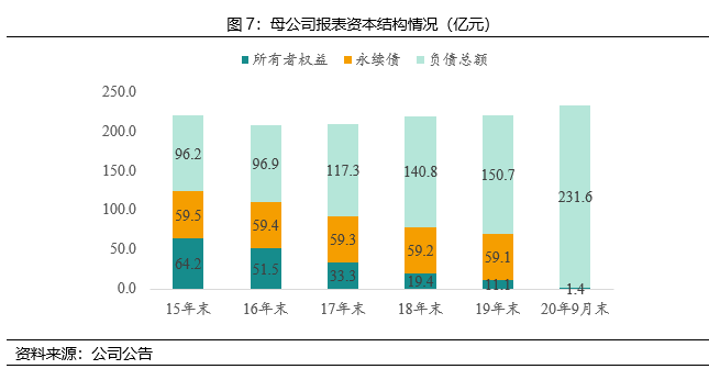 雖然資產(chǎn)規(guī)模變化不大,但由于歸母凈利潤(rùn)持續(xù)虧損,資本結(jié)構(gòu)上發(fā)生了巨大的變化,所有者權(quán)益急劇縮水,而負(fù)債規(guī)模大幅攀升。15年末至20年9月末期間,由于持續(xù)虧損,母公司報(bào)表所有者權(quán)益(不含永續(xù)債)從64.2億元縮水至1.4億元,同時(shí)20年下半年2只“5+N”的永續(xù)債到期(若不償還則利率跳升300BP),合計(jì)約60億元。負(fù)債總額(不含永續(xù)債)期間從96.2億元增長(zhǎng)至231.6億元,其中有息債務(wù)從80.4億元增長(zhǎng)至154.7億元。另外,20年三季度在永續(xù)債減少的同時(shí),其他應(yīng)付款增加了約50億元,而合并報(bào)表其他應(yīng)付款變動(dòng)不大,推測(cè)是母公司占用了子公司款項(xiàng)以應(yīng)對(duì)永續(xù)債到期。