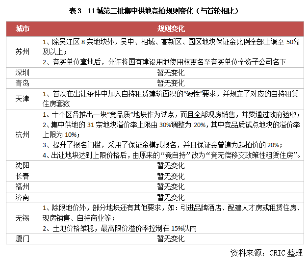 土拍規則方面,本輪集中供地競拍規則較首輪更加完善和細化,體現了精準調控的方向,尤其是上輪競拍中市場熱度較高的杭州、無錫、蘇州等城市,均針對其首輪拍地時暴露出的問題,出臺了“打補丁”新規。