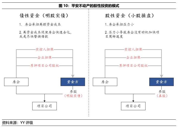 而導致項目周轉(zhuǎn)率低的主因,除了底層投資標的和項目合作方不靠譜外,大概率是股性資金觸發(fā)了合作方人性的弱點“低資金壓力導致項目去化動機較小”。(若為股+債權(quán)模式,平安5.90%的利息成本對于地產(chǎn)開發(fā)商仍較低廉)