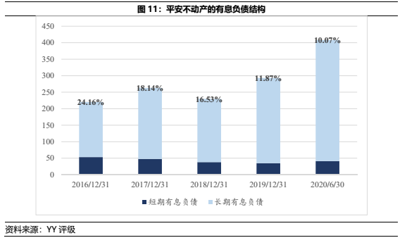 由于平安不動產(chǎn)的管理規(guī)模擴增是基于平安集團的LP資金(體現(xiàn)于長期股權(quán)投資方面的表外)注入,而表內(nèi)的結(jié)構(gòu)穩(wěn)定則是基于主動投資收益尚能覆蓋財務(wù)費用,疊加被動收入和股東背景支持。因此圖11可見,隨著有息負債杠桿的增加,平安不動產(chǎn)仍能維持相當?shù)捅壤亩唐谟邢鶆?wù)。