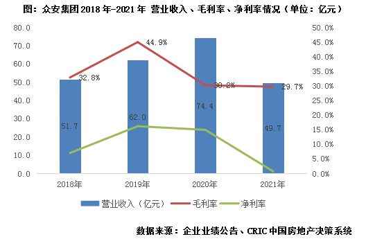 【結轉不暢致營收下降,2021年凈利率僅0.8%】2021年眾安集團實現營業收入49.7億元,其中地產銷售收入由于結轉時間的影響為42.8億元,同比下降36.6%,是企業營收下降的主要因素。酒店經營、商業租賃及物業管理等多元化業務收入約6.9億元,整體與2020年持平。關于地產結轉問題,業績會上管理層預期2022年會有修復,全年結轉收入會在100億以上。2021年眾安集團實現整體毛利潤約14.8億元,整體毛利率約為29.7%,相較2020年略降0.5個百分點。根據管理層透露,未來企業毛利率將會持續維持在30%的水平。全年凈利潤僅0.39億元,凈利率0.8%。