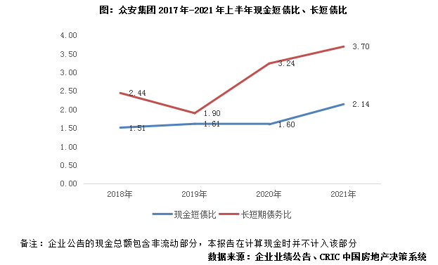 現金短債比22.14,長短債比3.70。截止至2021年底,眾安集團共持有現金77.5億元,相較2020年底增32.7%。整體現金短債比進一步提升至2.14,在滿足三道紅線的前提下進一步鞏固債務安全。長短債比方面,截止至2021年年底企業長短債比為3.70,處于行業領先水平。具體而言,企業借款總額約為人民幣169.9億元,其中一年以內債務占比21%,1-2年債務占比45%,2年到5年債務占比28%,5年以上債務占比6%,未來1-2年將會迎來償債高峰,需進一步關注債務安全。
