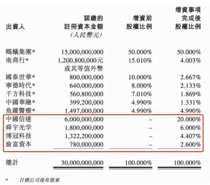 新股東中國(guó)信達(dá)、舜宇光學(xué)、博冠科技、渝富資本分別新增注冊(cè)資本60億元、18億元、13.222億元和7.8億元。