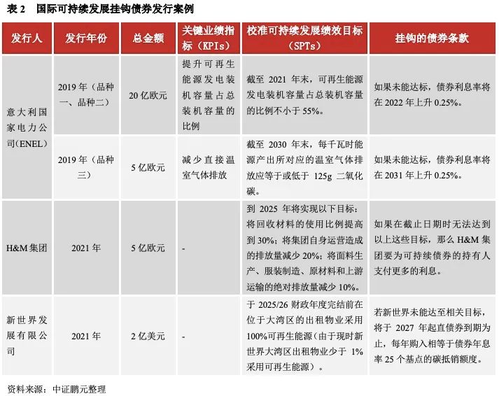 根據《可持續發展掛鉤債券(SLB)十問十答》,可持續發展掛鉤債券已累計發行總額約180億美元,發行人涉及電力、鋼鐵、水泥、建筑等多個行業。我們根據公開信息搜集到幾個發行案例,發行人所屬行業有電力、服裝、建筑,如表2所示,國際發行的可持續發展掛鉤債券掛鉤的債券條款有利率調升、購入碳抵銷額度等。