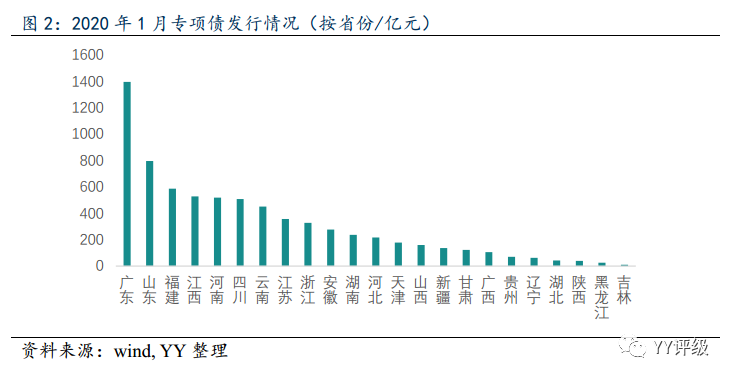 從發行地區來看,1月份發行專項債較多的省份有廣東省(占比19.5%)、山東省(占比11.1%)、福建?。ㄕ急?.2%)、江西?。ㄕ急?.4%)、河南?。ㄕ急?.3%)。從發行主體來看,除了深圳市、青島市、廈門市為地級市政府,其他發債主體都是省級人民政府或直轄市人民政府。