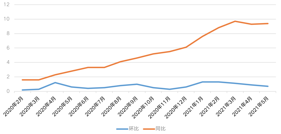 從房價的角度而言,國家統計局數據顯示,自2020年以來上海二手房價格指數持續走高,其中同比上漲幅度增加較為明顯,5月二手住宅房價同比上漲9.5%。