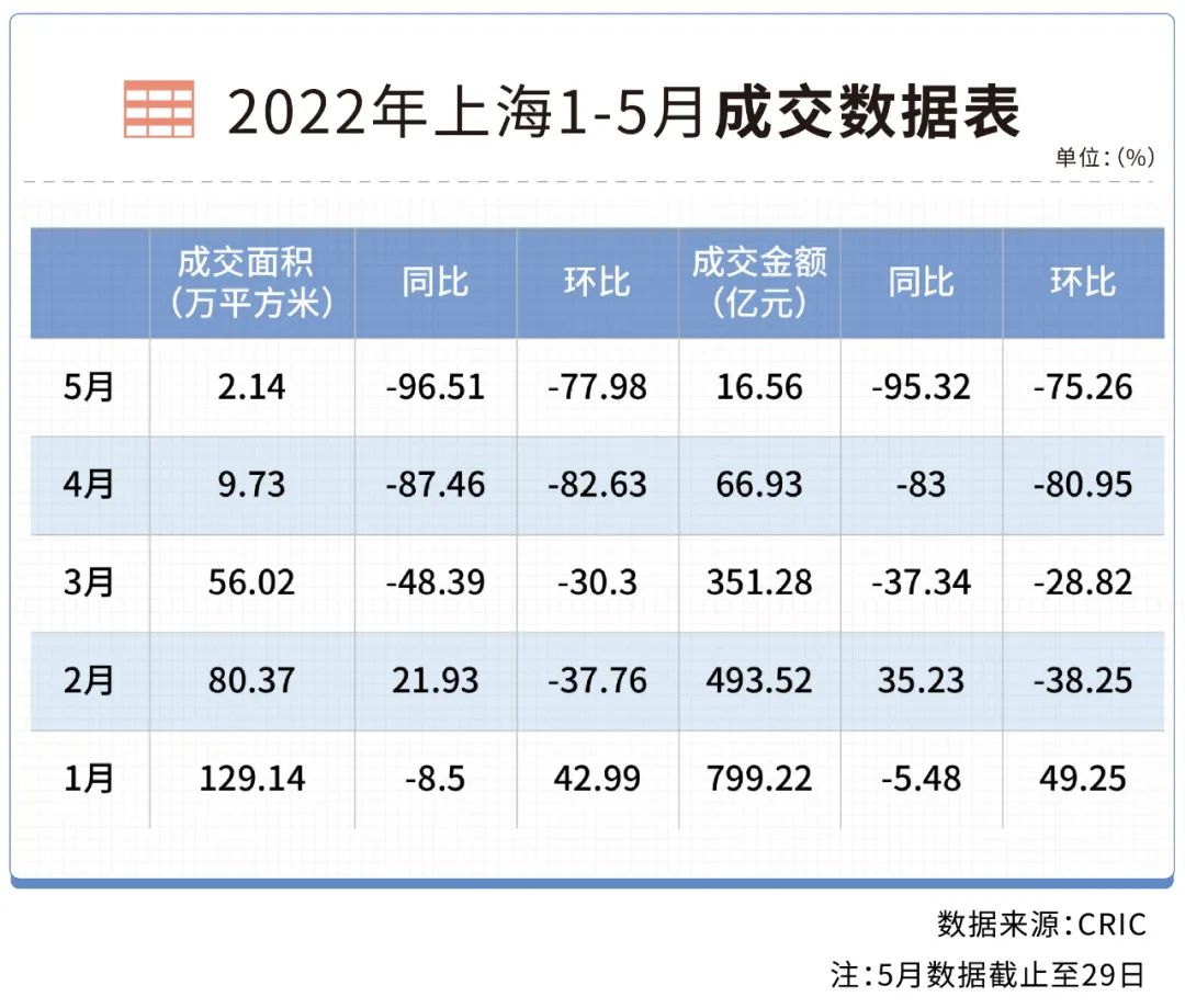 從房地產(chǎn)市場來看,4月新房供應環(huán)比減少97%,同比減少97%,成交面積環(huán)比減少83%,同比減少87%,5月成交陷入低谷,截止至2022年5月29日,5月新房成交2.14萬平方米同比下降96.51%,在4月跌8成的基礎上進一步環(huán)比下降77.98%,受其影響,整個長三角地區(qū)成交同樣慘淡。