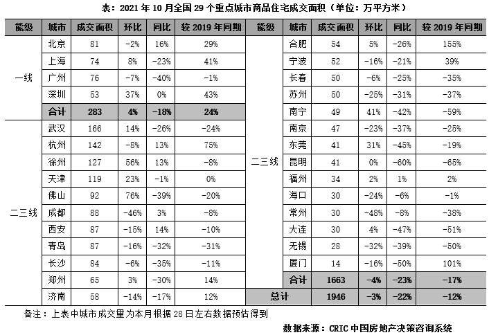 10月,典型城市商品住宅成交熱度延續(xù)低位波動,基本“見底”,29個監(jiān)測城市預計成交規(guī)模達1946萬平方米,環(huán)比微降3%,同比降幅有收窄趨勢,下降22%,較2019年同期降幅為12%。