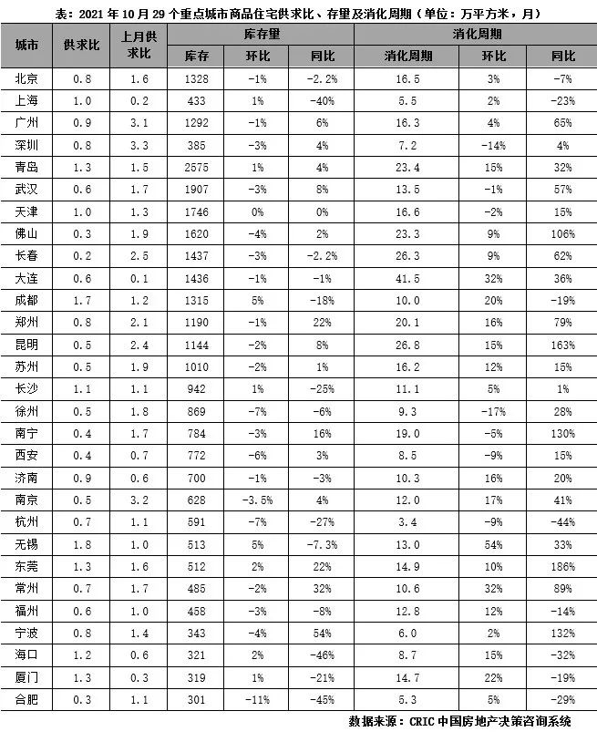 “金九”銷售節(jié)點過后,三四線城市新盤推貨量下滑下,10月熱點城市供應環(huán)比下滑較成交更為顯著,故短期呈現供不應求。29個重點城市整體供求比略低于0.8。