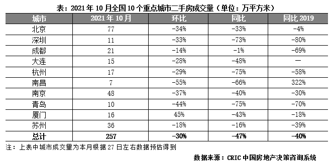 2021年10月,二手房市場整體延續(xù)下行走勢,規(guī)模上環(huán)比再降30%,10個重點城市共計成交257萬平方米。較去年同期相比規(guī)模收窄48%,同比2019年跌幅也高達40%,受困于全國樓市政策“嚴苛”,熱點城市調控力度有增無減,整體市場熱度降溫顯著。