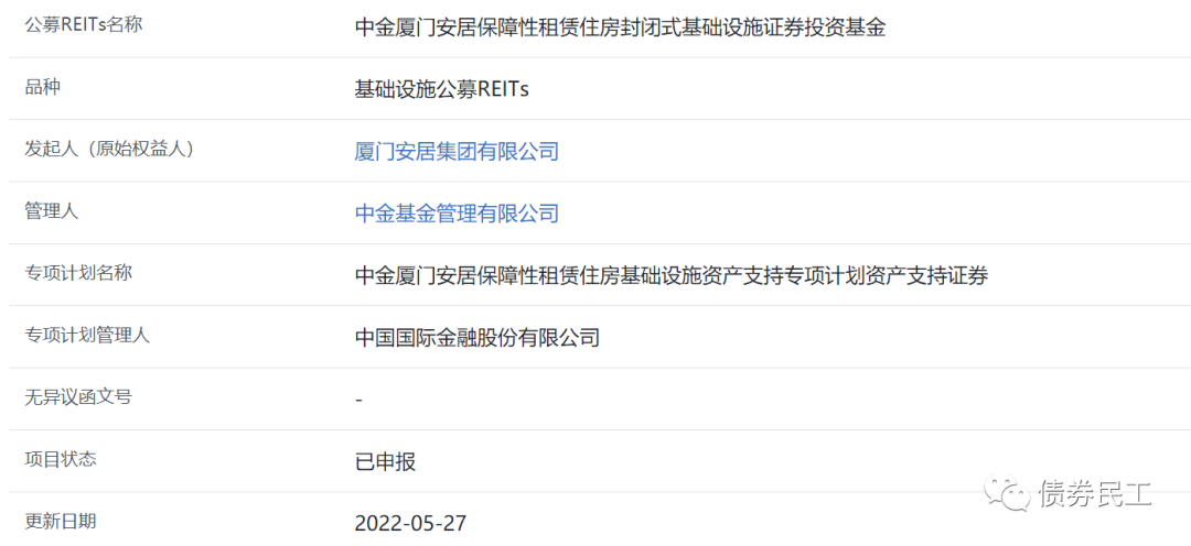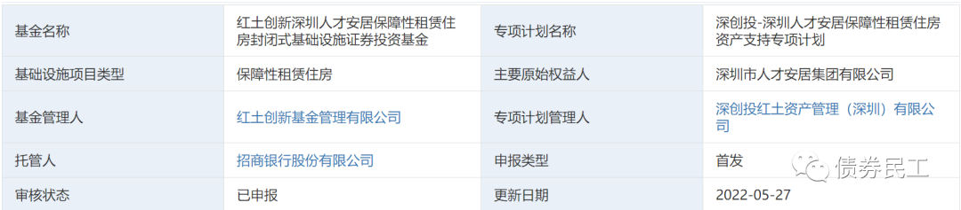 上交所和深交所在2022年5月27日已經(jīng)分別有一單保障性租賃住房REITs完成了申報(bào),分別為中金廈門安居保障性租賃住房封閉式基礎(chǔ)設(shè)施證券投資基金和紅土創(chuàng)新深圳人才安居保障性租賃住房封閉式基礎(chǔ)設(shè)施證券投資基金。
