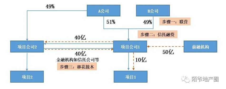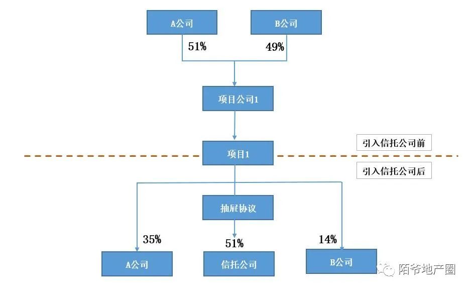 步驟二、通過信托機(jī)構(gòu)進(jìn)行前融,信托公司引入,增持a項(xiàng)目股權(quán)至51%