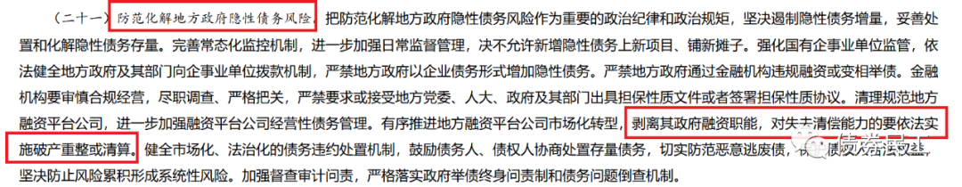 但是,這并不是監(jiān)管文件中第一次提出這個(gè)說法。2021年4月13日,國務(wù)院印發(fā)了《關(guān)于進(jìn)一步深化預(yù)算管理制度改革的意見》(國發(fā)[2021]5號),已經(jīng)明確提出“清理規(guī)范地方融資平臺公司,剝離其政府融資職能,對失去清償能力的要依法實(shí)施破產(chǎn)重整或清算”。