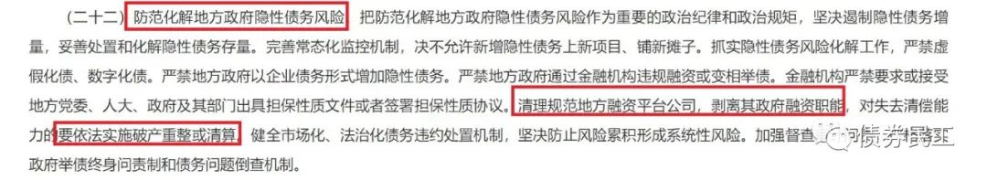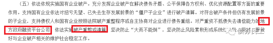 (2)對于企業(yè)債券的償債責(zé)任履行,鼓勵(lì)債務(wù)人(融資平臺公司)按照企業(yè)債券類債務(wù)有關(guān)管理政策進(jìn)行債務(wù)重組或者通過企業(yè)破產(chǎn)等市場化方式處置。這里的企業(yè)債券概念應(yīng)該是廣義上的信用債券概念,也是通過債務(wù)重組和破產(chǎn)方式進(jìn)行化解債務(wù)問題。