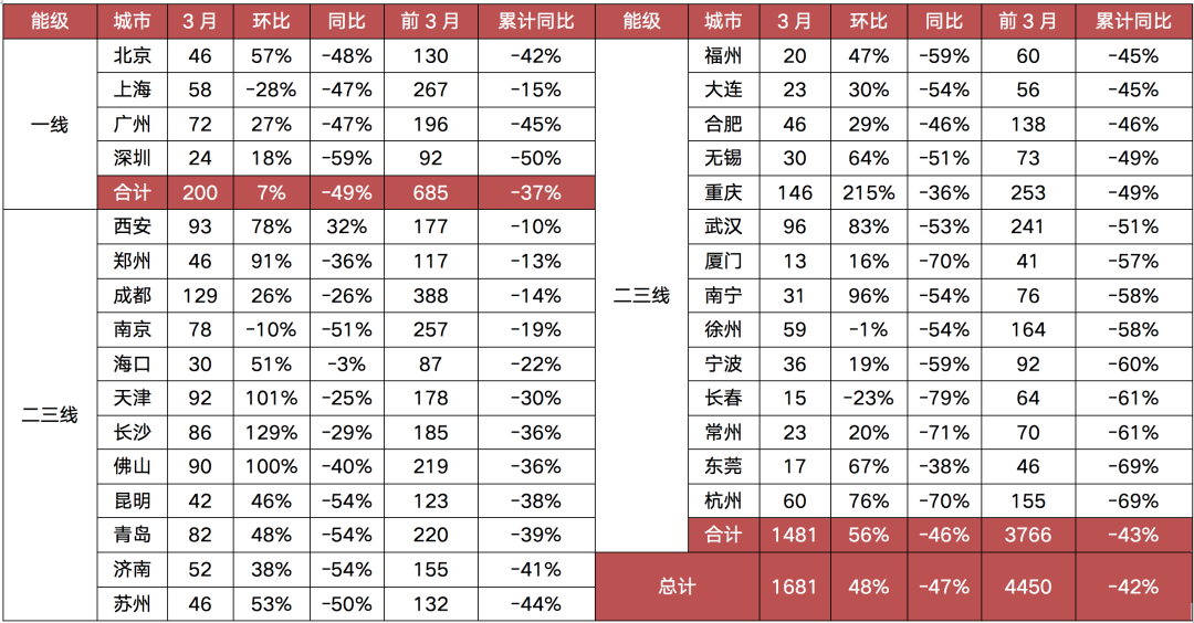 從成交來看,3月30個監(jiān)測城市新建商品住宅成交面積為1681萬平方米,環(huán)比上漲48%,同比下降47%。一季度30個監(jiān)測城市成交面積累計同比下降42%,較前2月(累計同比下降39%)降幅擴大3pcts。