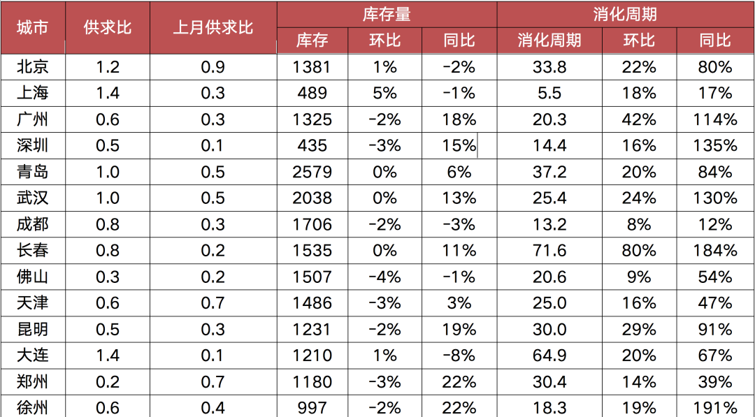 表:2022年3月30個重點城市商品住宅供求比、存量及消化周期(單位:萬平方米,月)