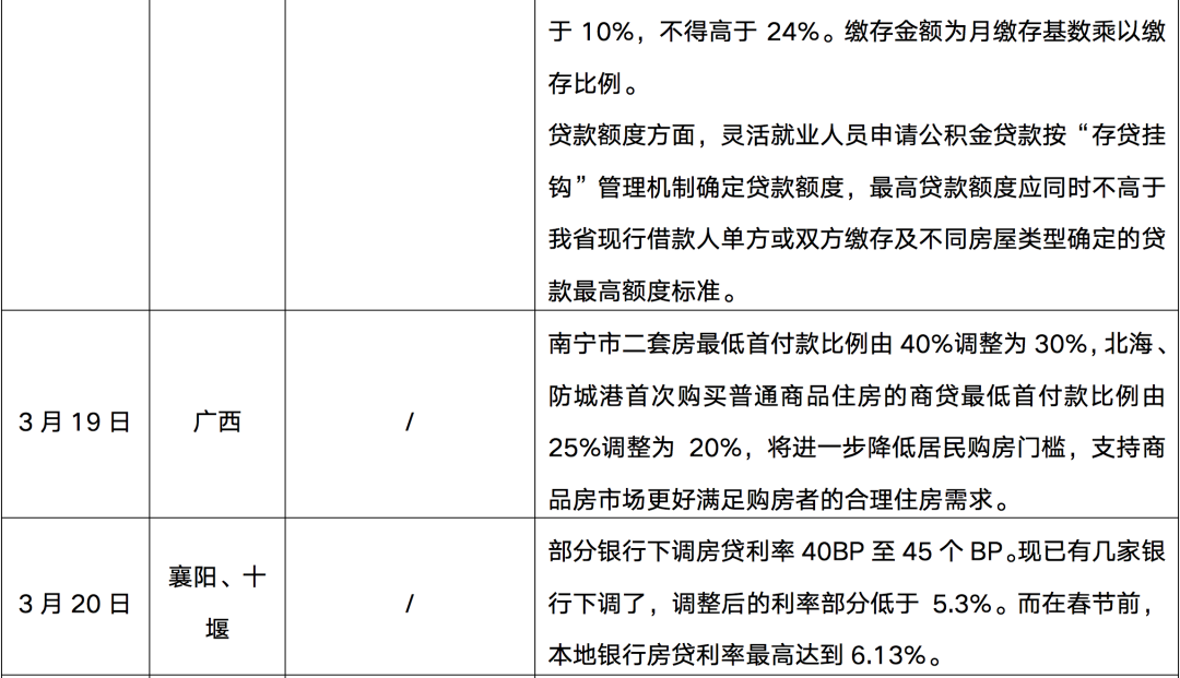 另一方面,隨著3月兩會召開,從中央五部委發(fā)聲穩(wěn)定房地產(chǎn),到各級地方政府出臺包括降首付、擴大公積金、降房貸利率等一系列利好措施,都在為整體市場釋放積極信號,房企從推盤到開工的信心正在逐步恢復。