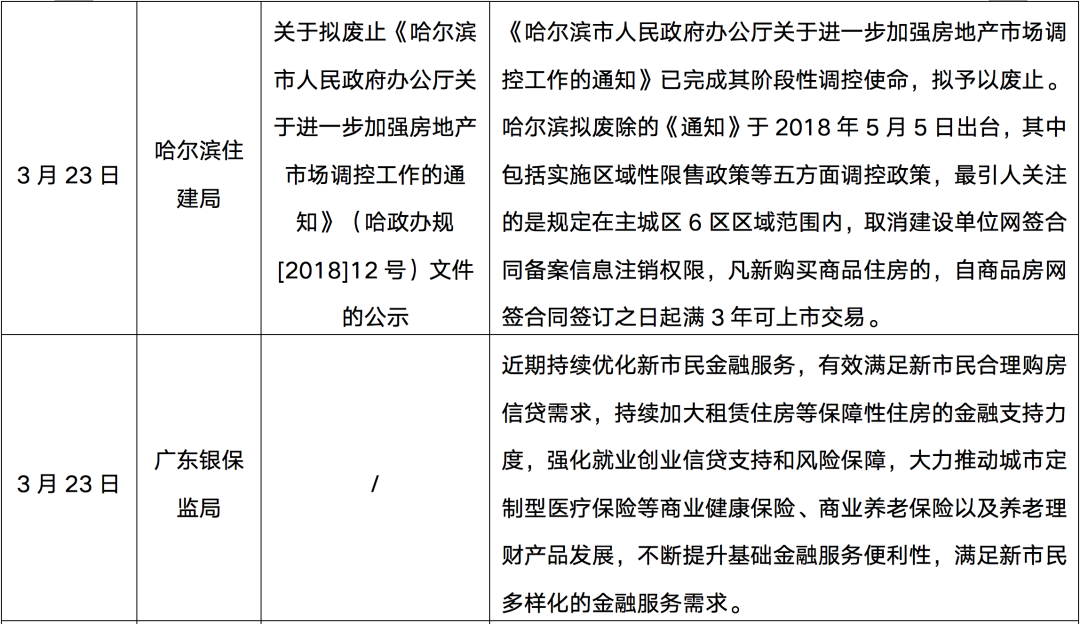 其四,鄭州、哈爾濱、福州等局部放松乃至取消“四限”,例如哈爾濱取消區(qū)域性限售政策。