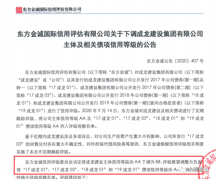 近日,東方金誠(chéng)公告稱,將成龍建設(shè)集團(tuán)有限公司(以下簡(jiǎn)稱“成龍集團(tuán)”)主體信用等級(jí)由AA下調(diào)為BB,評(píng)級(jí)展望調(diào)整為負(fù)面;將“17成龍01”、“17成龍03”、“18成龍01”和“19成龍01”債項(xiàng)信用等級(jí)由AA下調(diào)為BB并移出評(píng)級(jí)觀察名單。