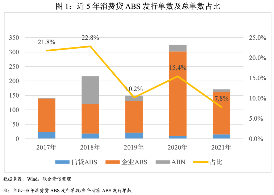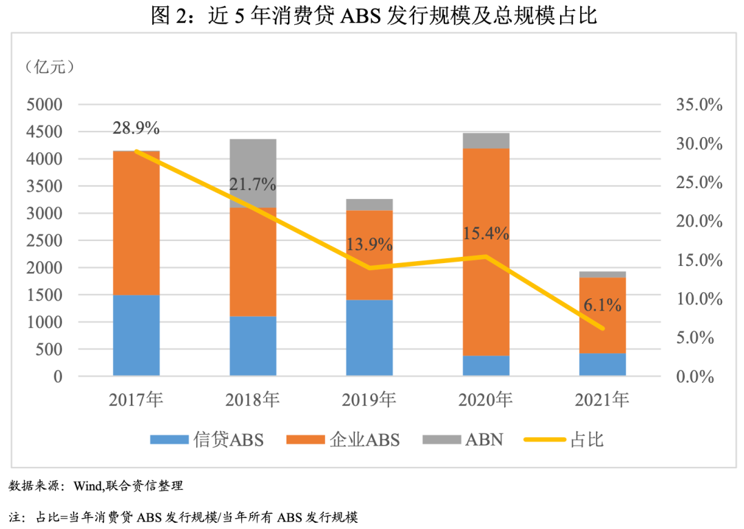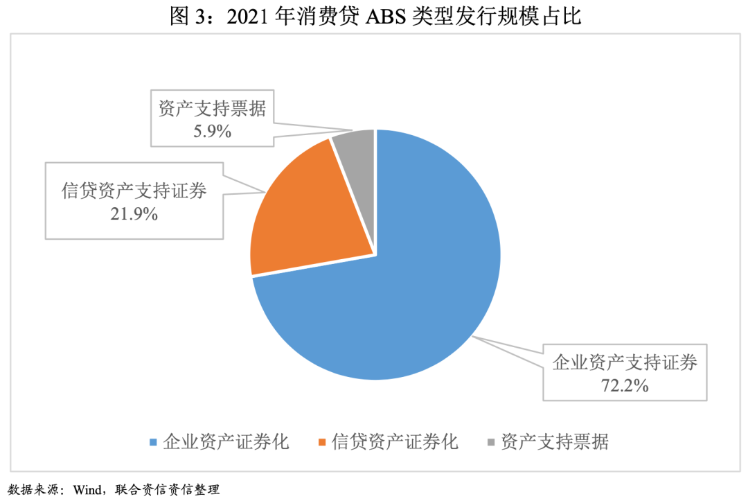 從細分市場看,2021年,消費貸ABS市場共發(fā)行148單企業(yè)ABS,15單信貸ABS和8單ABN,發(fā)行量分別為1392.20億元、421.72億元及113.40億元,企業(yè)ABS在發(fā)行單數(shù)及規(guī)模上一直處于絕對優(yōu)勢,2021年單數(shù)占據(jù)86.5%份額,規(guī)模占據(jù)72.2%份額。縱向來看,受小貸公司注冊資本、杠桿率趨嚴等要求,小貸公司證券化融資需求增加,2020年消費貸企業(yè)ABS發(fā)行量大幅提升,但2021年受監(jiān)管對發(fā)行政策收緊的影響,消費貸企業(yè)ABS發(fā)行量下降明顯,接近2019年水平;消費貸信貸ABS及消費貸ABN發(fā)行量近幾年占比均較低,且呈現(xiàn)波動下降的趨勢,2021年消費貸信貸ABS發(fā)行規(guī)模占比為21.9%,消費貸ABN發(fā)行規(guī)模占比僅5.9%。