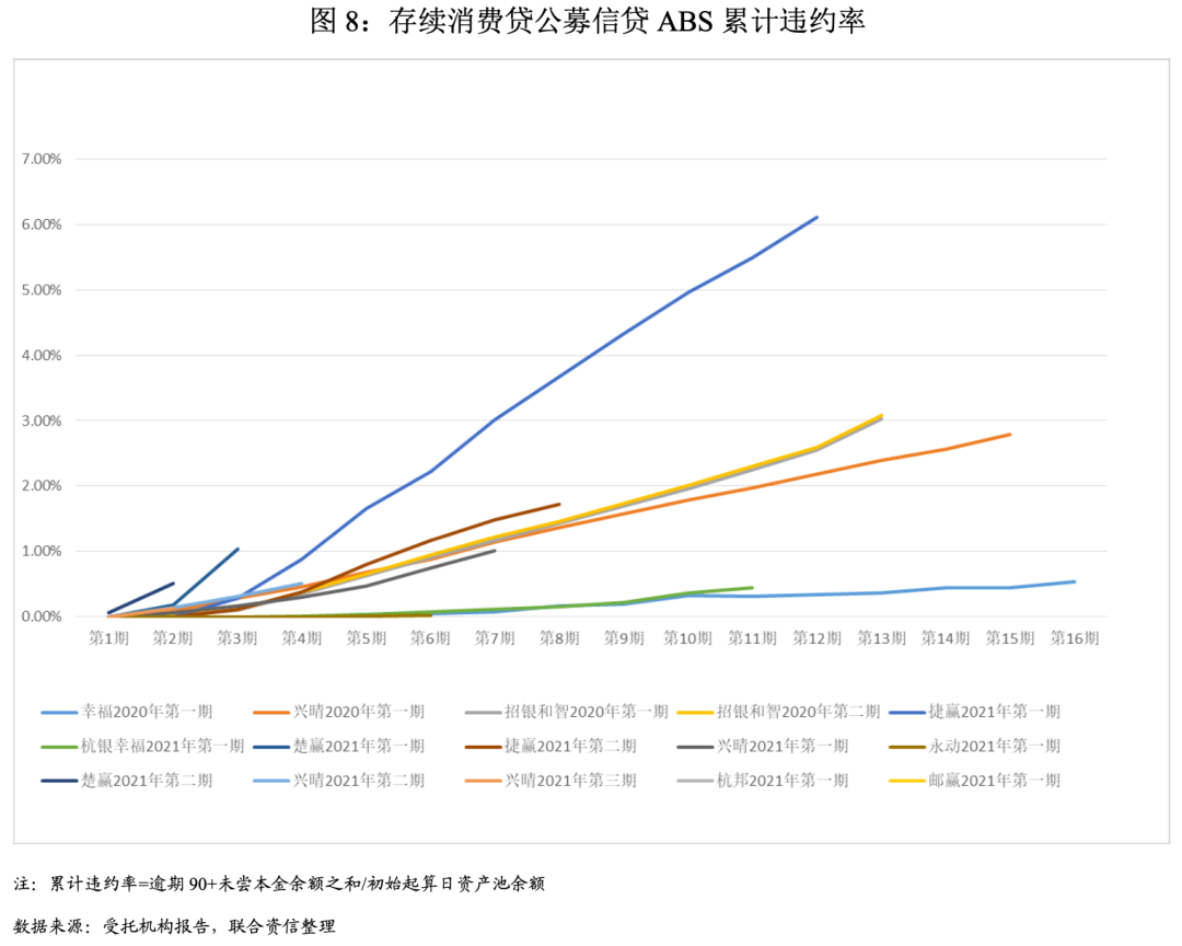 由于數(shù)據(jù)可獲得性,本文對消費貸ABS存續(xù)期表現(xiàn)觀測,主要基于截至2021年底存續(xù)且已披露受托機構(gòu)報告的公募信貸ABS產(chǎn)品。