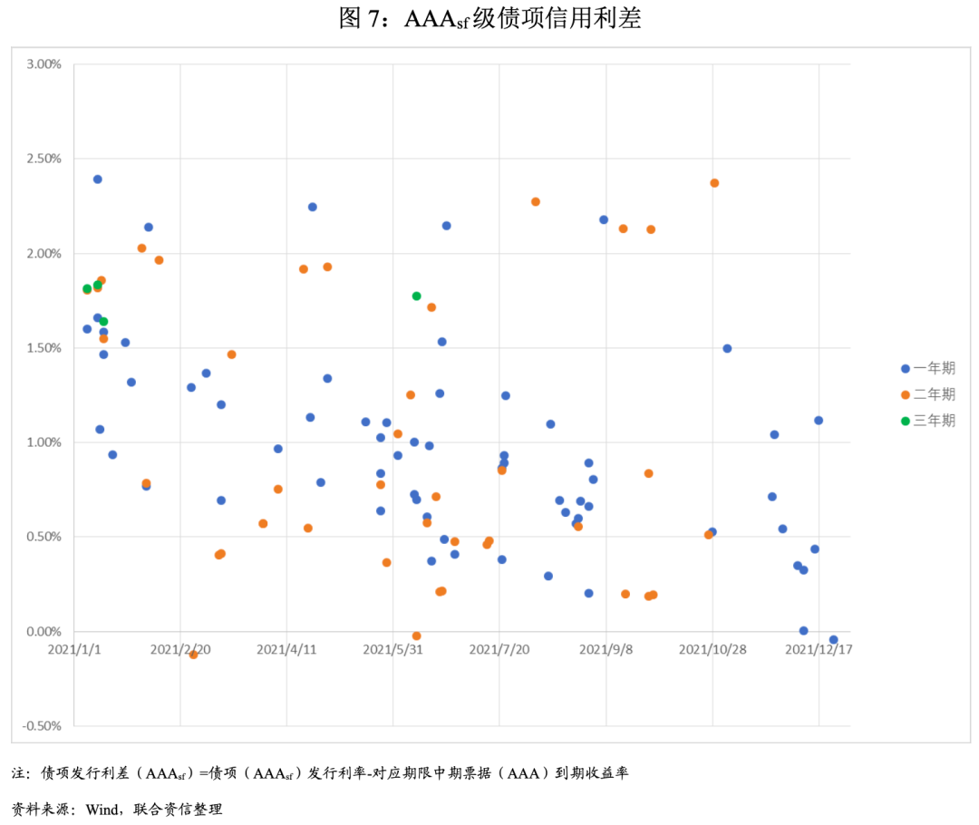 2021年,消費貸ABS債項普遍高于對應期限中期票據(jù)債項利率,AAAsf級別下,1年期債項利差均值為98bp,2年期債項利差均值為99bp,3年期利差均值為177bp。