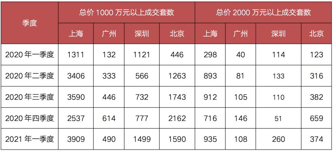 2021年一季度,四大一線城市總價1000萬元以上各價格段豪宅成交數據較去年同期均實現翻倍式增長。