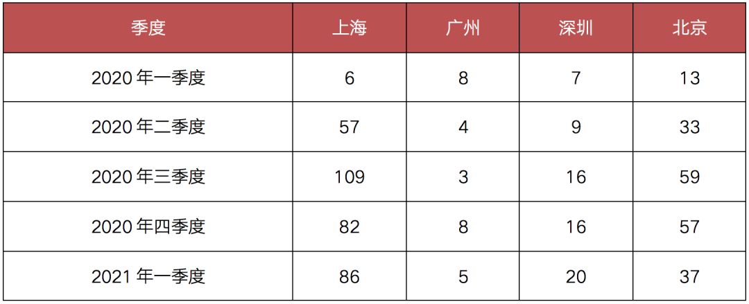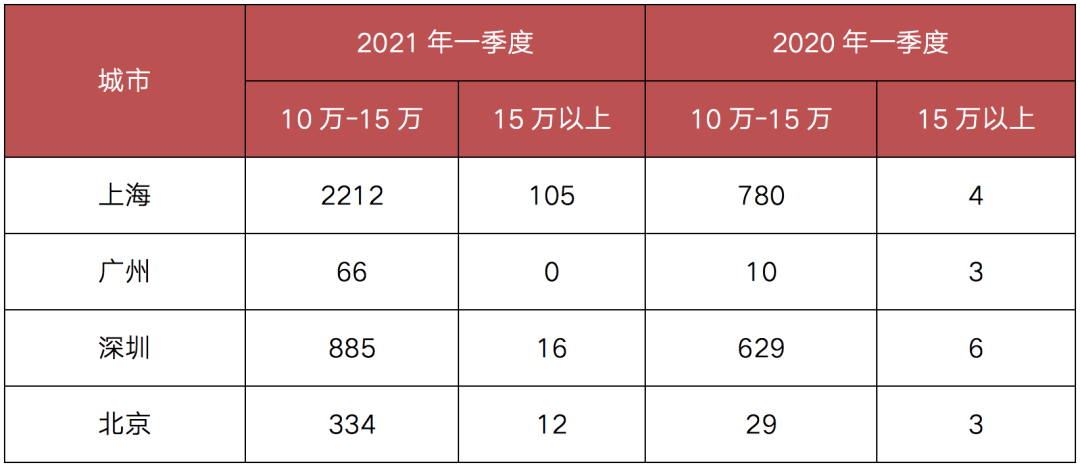以1000萬元作為豪宅門檻值來看,北上廣深四大一線城市豪宅成交總量為7488套,較2020年一季度的3010套增長了149%,其中上海共成交3909套,超過北京、深圳和廣州成交之和,且較2020年一季度同比增長198%。