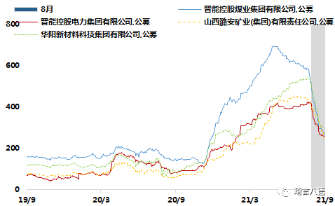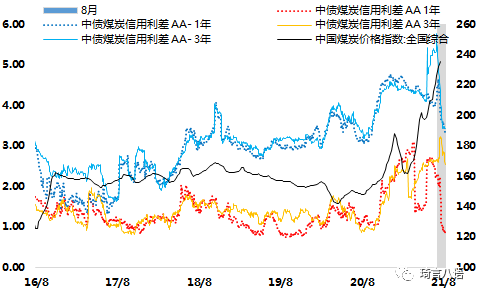 高等級的山能、晉焦受息差限制下行幅度較小;山西五大煤加速下行150~200BP;冀中及平煤股份利差也明顯改善。特別是中低等級3年信用利差首次下行,說明部分機(jī)構(gòu)(大概率還是銀行為主)開始認(rèn)可煤債中長期限的配置價(jià)值。