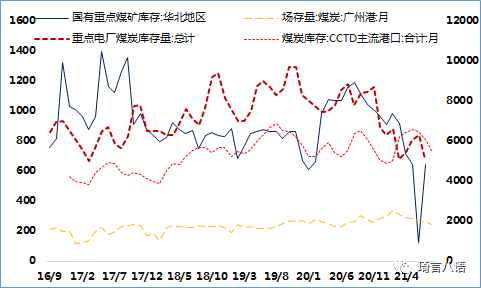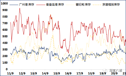 第二,老話長談,各口徑庫存數(shù)據(jù)仍處于低位,且全年低庫存狀態(tài)可能導(dǎo)致下游電廠的冬儲需求前置: