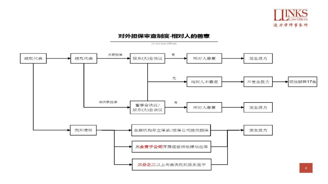 根據最高院的統計,2006年至2015年全國法院審結的455件公司未經法定程序對外擔保的商事案件,其中認定擔保合同有效的判決占49.8%; 而認定擔保合同無效的判決占50.2%, 該等混亂的狀態在最高院于2019年11月8日頒布《全國法院民商事審判工作會議紀要》(“《九民紀要》”)后基本告一段落,《九民紀要》明確了接受對外擔保的債權人需要審查公司內部決議的基本原則。