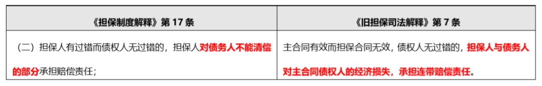 說重大,因為如果我們結合《擔保制度解釋》第25條的規定,就會發現 “對債務人不能清償的部分”的表述屬于典型的“一般保證”。換言之,主合同有效的情況下,如果債權人無過錯,那么有過錯的擔保人需要承擔的賠償責任從“連帶賠償責任”變為類似于“一般保證”的僅“對債務人不能清償的部分”進行賠償。