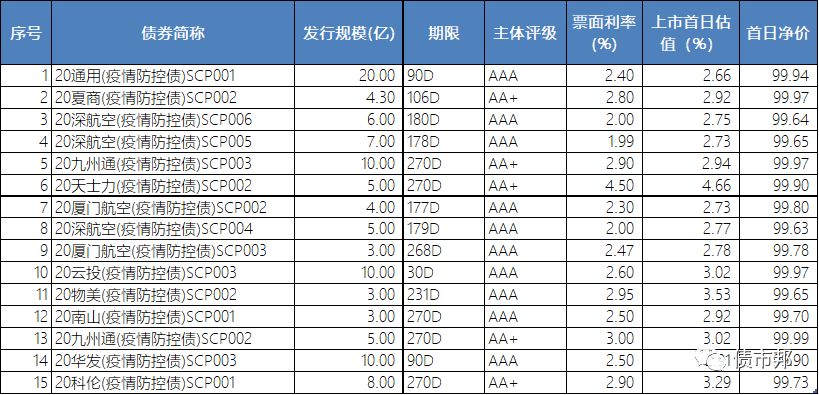 對有估值的15支疫情防控債做了小匯總,可以看到發行利率普遍要低于市場估值。主承(投資人)是拿出了應有的擔當,是拿出真金白銀去支持此次債市抗疫了。主承(投資人)如果該拿的票息一點沒少拿,該收的中收一點沒少收,說自己是在支持債市抗疫,是有點站不住腳的。畢竟連央行和財政都通過專項再貸款+財政補貼的表內信貸組合拳去降低抗疫重點企業的融資成本了(確保企業實際融資成本降至1.6%以下),債券這塊也需要有所表示。