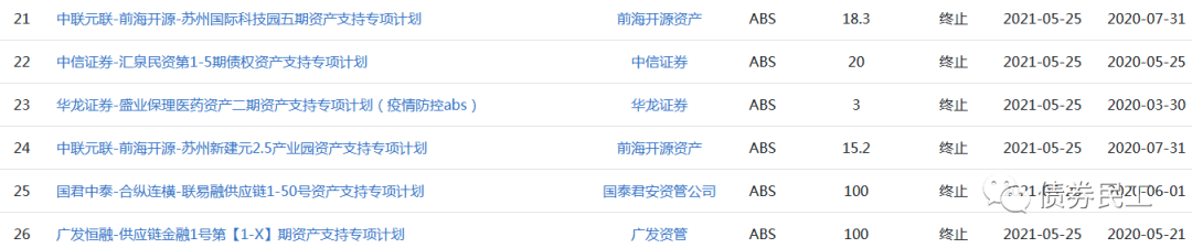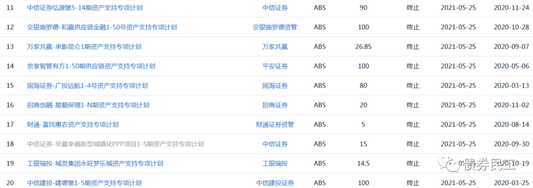 從本次終止的ABS的產(chǎn)品類型來看,包括供應(yīng)鏈金融資產(chǎn)證券化產(chǎn)品、保理資產(chǎn)證券化產(chǎn)品、PPP項目資產(chǎn)證券化產(chǎn)品、疫情防控ABS等各種類型的資產(chǎn)證券化產(chǎn)品。