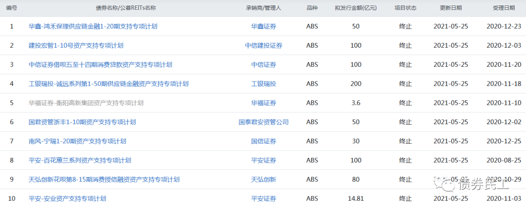 2021年5月25日,絕對是資產(chǎn)證券化歷史上一個載入史冊的日子:就在今天,上海證券交易所終止了26只ABS產(chǎn)品的審核,合計擬發(fā)行金額為1536.26億元,終止數(shù)量和終止金額都是創(chuàng)歷史的最高了!目前暫未看到相關(guān)資產(chǎn)支持證券的計劃說明書等材料,尚不確定此次終止的原因。