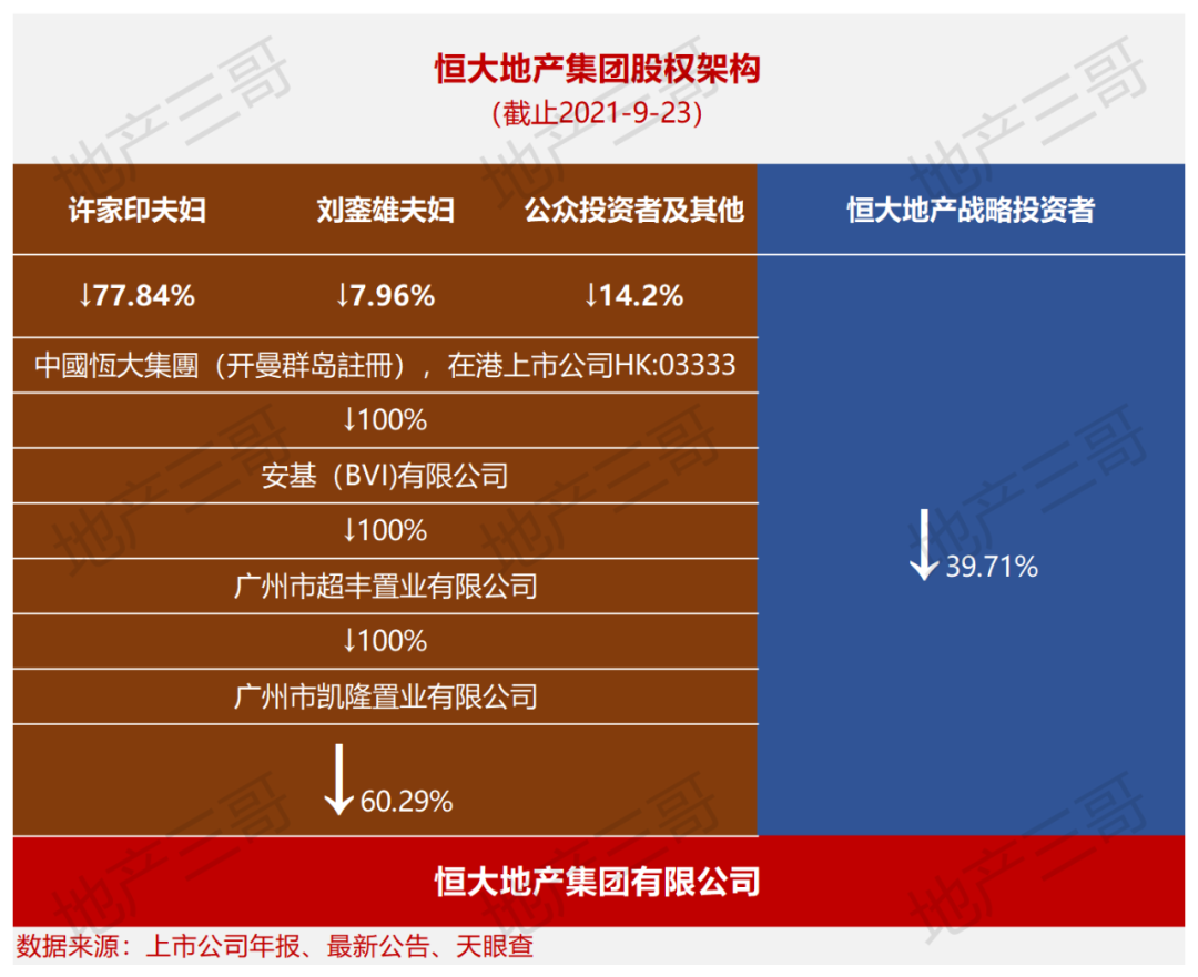 目前,上市公司中國恒大(HK:03333)對恒大地產(chǎn)集團(tuán)持股比例為60.29%,其中:許家印夫婦對恒大地產(chǎn)集團(tuán)的持股比例為46.93%;戰(zhàn)略投資者對恒大地產(chǎn)集團(tuán)的持股比例為:39.71%。