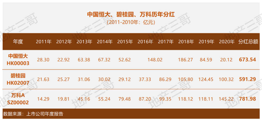 根據(jù)上市公司中國恒大各年年報(bào),從附注中會計(jì)科目:股息,中國恒大十年分紅673億元(詳見下文中國恒大、碧桂園、萬科歷年分紅圖表)。