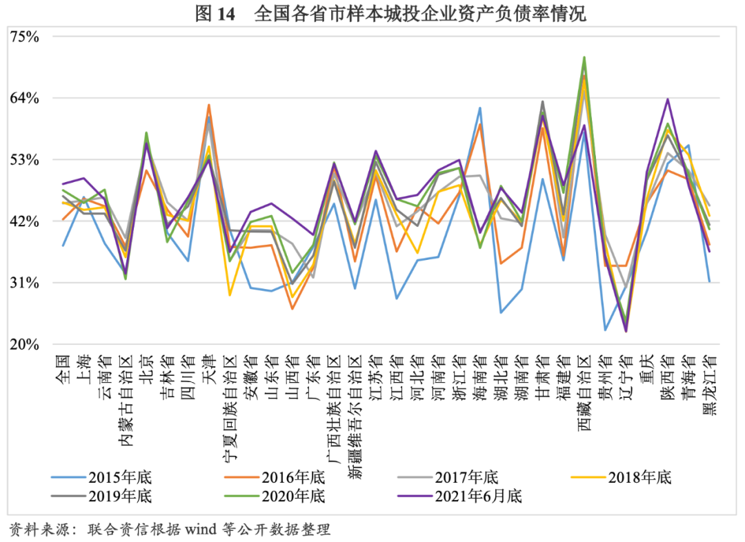 從級別分布來看,2015-2020年及2021年6月底,級別越高的樣本城投企業資產負債率、全部債務資本化比率也相對越高。近六年,除了AAA、AA+、AA-樣本城投企業的資產負債率、全部債務資本化比率在個別年份略有下降外,各級別樣本城投企業在2015-2020年均保持上升趨勢;但在去杠桿的進程中,AAA、AA+樣本城投企業兩個指標變化幅度不大,保持較強的韌性;AA、AA-樣本城投企業兩個指標表現為上升趨勢,但增速自2018年后逐漸趨緩。