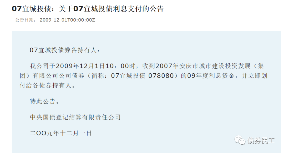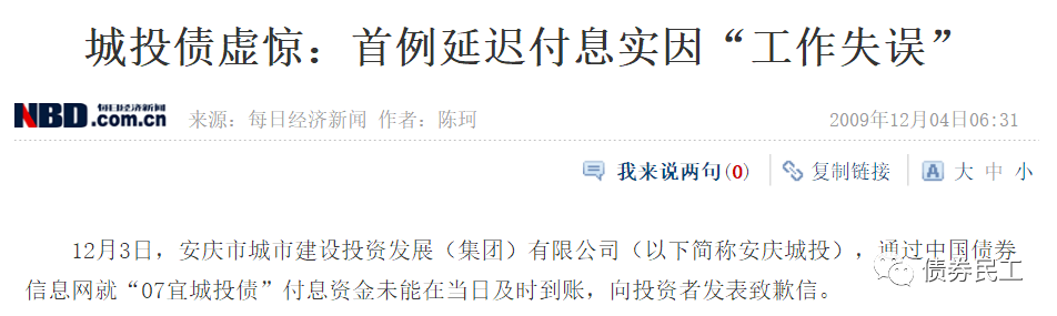 安慶市城市建設投資發展(集團)有限公司于2007年11月30日發行了“2007年安慶市城市建設投資發展(集團)有限公司公司債券”(以下簡稱“07宜城投債”),付息日為每年的11月30日?!?7宜城投債”本應該于2009年11月30日本期債券2009年度的支付債券利息,但是實際上支付時間為2009年12月1日,延遲了一天。安慶城投發布致歉信,明確利息延遲支付的原因是工作失誤。