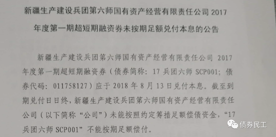 新疆生產建設兵團第六師國有資產經營有限責任公司于2017年11月16日發行了“新疆生產建設兵團第六師國有資產經營有限責任公司2017年度第一期超短期融資券”(以下簡稱“17兵團六師SCP001”),債券到期日為2018年8月13日。新疆生產建設兵團第六師國有資產經營有限責任公司于2018年8月13日發布公告,“17兵團六師SCP001”未按期足額兌付債券本息。