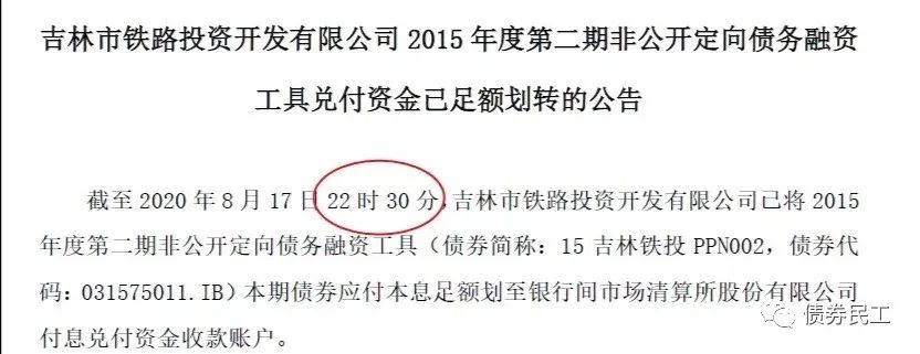 吉林市鐵路投資開發有限公司于2015年8月17日發行了“ 吉林市鐵路投資開發有限公司2015年度第二期非公開定向債務融資工具”(以下簡稱“15吉林鐵投PPN002”),到期日為2020年8月17日。“15吉林鐵投PPN002”于2020年8月17日當天17:00點前未完成資金劃付,出現了技術性違約。2020年8月17日晚上,發行人出具了“兌付資金已經足額劃轉的公告”,已經于17日晚上22點30分完成了資金的劃轉工作。