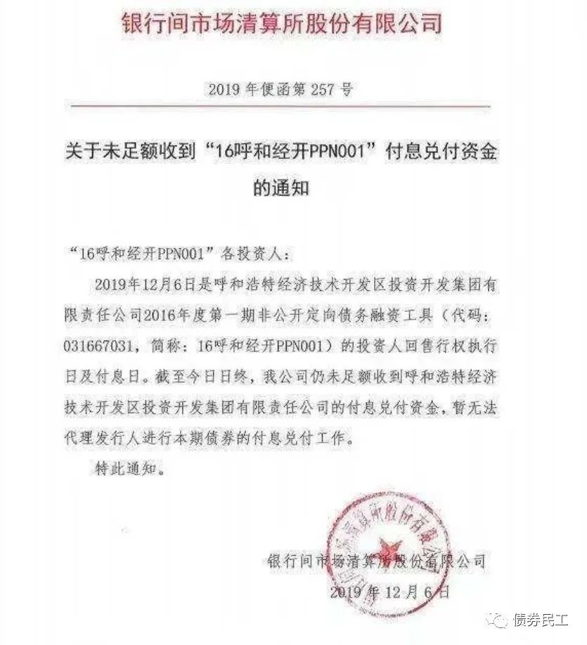 呼和浩特經濟技術開發區投資開發集團有限責任公司于2016年9月26日發行了“ 呼和浩特經濟技術開發區投資開發集團有限責任公司2016年第一期非公開定向債務融資工具”(以下簡稱“16呼和經開PPN001”),到期日為2019年12月6日。2019年12月6日,上清所發布公告,明確未足額收到“16呼和經開PPN001”付息兌付資金。