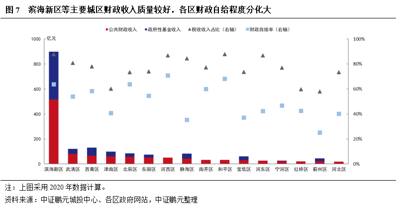 主要城區財政收入質量較好,各區財政自給程度分化大。2020年薊州區、紅橋區、津南區稅收收入占比低于70%,濱海新區、和平區、河西區等主要城區財政收入質量較好;河西區財政自給率超過70%,領先其他各區,薊州區、靜海區、寶坻區財政自給程度相對較低,其中薊州區2020年獲得市級補助收入50.2億元,以緩解地區資金壓力。政府性基金收入方面,天津市外環線以內土地出讓收入納入市級核算,故中心城區無政府性基金收入,濱海新區、西青區土地出讓較多,相關收入在各區中排名靠前,2020年僅濱海新區、靜海區和薊州區政府性基金收入較2019年增長。