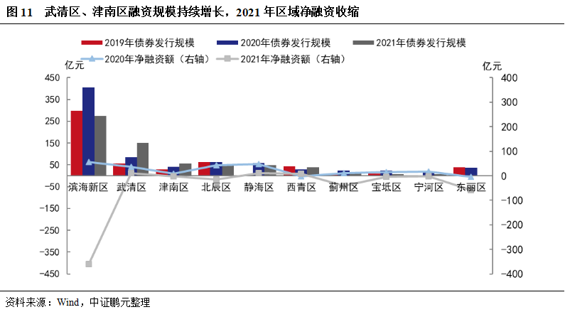 各區發展情況影響下屬企業融資能力,弱實力、高債務率區域融資承壓。天津市下轄各區中濱海新區融資體量最大,武清區其次,薊州區、寧河區、寶坻區融資體量較小,區域平臺融資情況與各區發展情況正向相關。受天津市信用環境變化影響,2021年僅武清區、津南區、西青區融資規模高于前年,其中武清區、津南區近三年融資規模持續增長,當年薊州區、寧河區、寶坻區、東麗區融資規模銳減,前述四區已發行的債券中私募債占比高于其他區域。結合各區經濟、財政表現和存續債務體量,實力弱、債務高企的轄區疊加了更高的信用風險,為市場投資末選,區域融資承壓。