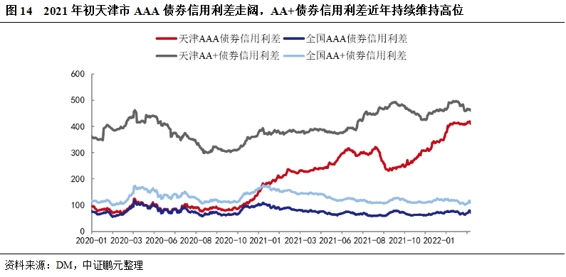 融資利率整體區間上移,區域信用利差走闊。以公司債、中票和短融產品為例,2021年天津市AAA和AA+主體融資利率中位數均有不同程度提高,其中AAA主體融資利率區間上移較多,銀行間產品發行利率中位數增加超過100bp。2021年天津市4家AA+主體發行的6支債券票面利率超過7.5%(含),4支債券由北辰區兩家主體發行,票面利率最高為8.5%。利差方面,2021年初天津市AAA債券信用利差走闊,AA+債券信用利差近年持續維持高位,隨著天津市政企對債務償還重視程度提升,預計AAA主體利差攀升勢頭將有所緩和,但短期內區域利差收窄可能性較低。