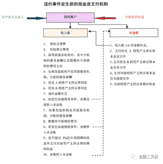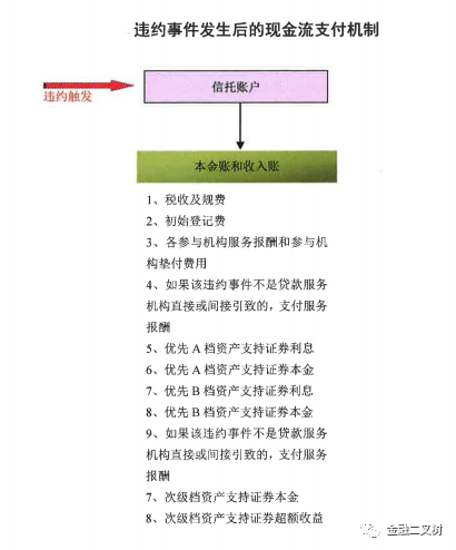 上圖所示產(chǎn)品有A、B檔兩個(gè)層級(jí)及次級(jí),當(dāng)出現(xiàn)違約事件后,償付順序是優(yōu)先A檔本金、利息 優(yōu)先B檔本金、利息 次級(jí)本金及超額收益。當(dāng)優(yōu)先A檔本息正常兌付時(shí),而B檔本息無法正常兌付時(shí),優(yōu)先B檔發(fā)生實(shí)質(zhì)違約,而當(dāng)次級(jí)本金損失,而優(yōu)先A、B檔正常兌付本息時(shí),小編認(rèn)為沒有發(fā)生實(shí)質(zhì)違約,風(fēng)險(xiǎn)事件會(huì)影響現(xiàn)金流分配但不一定導(dǎo)致違約。